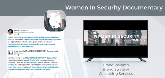 "Resilient Features and The Women in Security Documentary would like to offer a special “Thank You” to Suzanna Alsayed and her company, Evolutz, for creating our new TWISD banner and logo! Please give them a big round of applause!!"